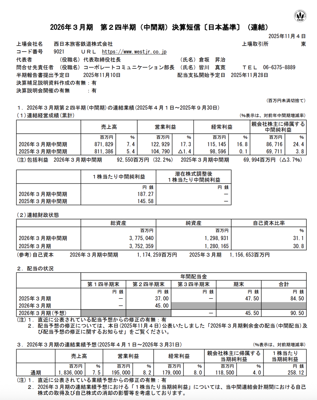 売上高:8718億2900万円(前年同期比+7.4%)営業利益:1229億2900万円(同+17.3%)経常利益:1151億4500万円(同+16.8%)純利益:867億1600万円(同+24.4%)