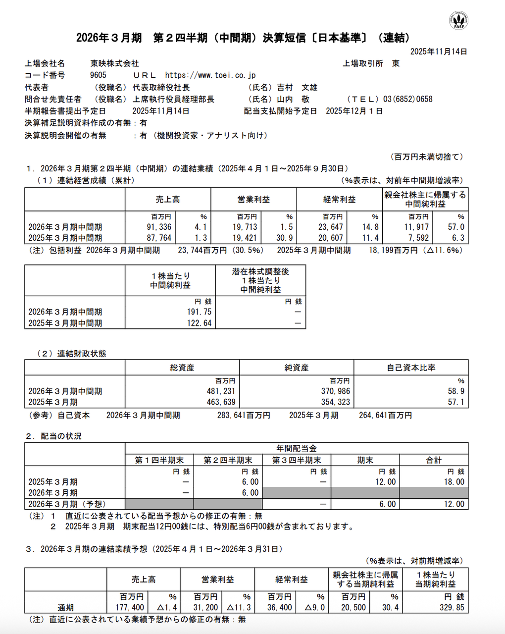 売上高:913億3600万円(前年同期比+4.1%)営業利益:197億1300万円(同+1.5%)経常利益:236億4700万円(同+14.8%)純利益:119億1700万円(同+57.0%)