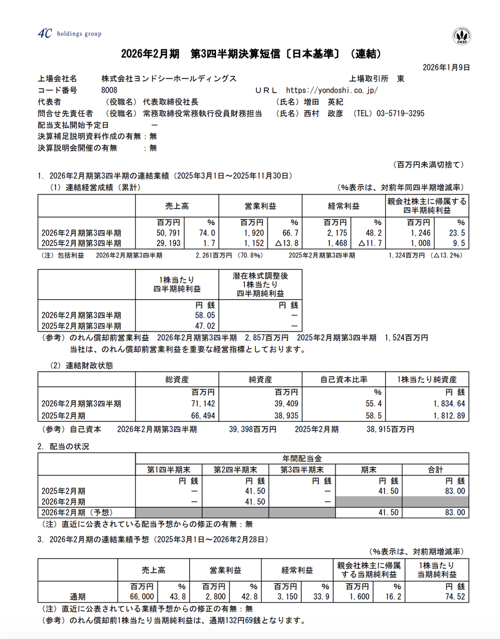 売上高:507億9100万円(前年同期比.+74.0%)営業利益:19億2000万円(同+66.7%)経常利益:21億7500万円(同+48.2%)純利益:12億4600万円(同+23.5%)