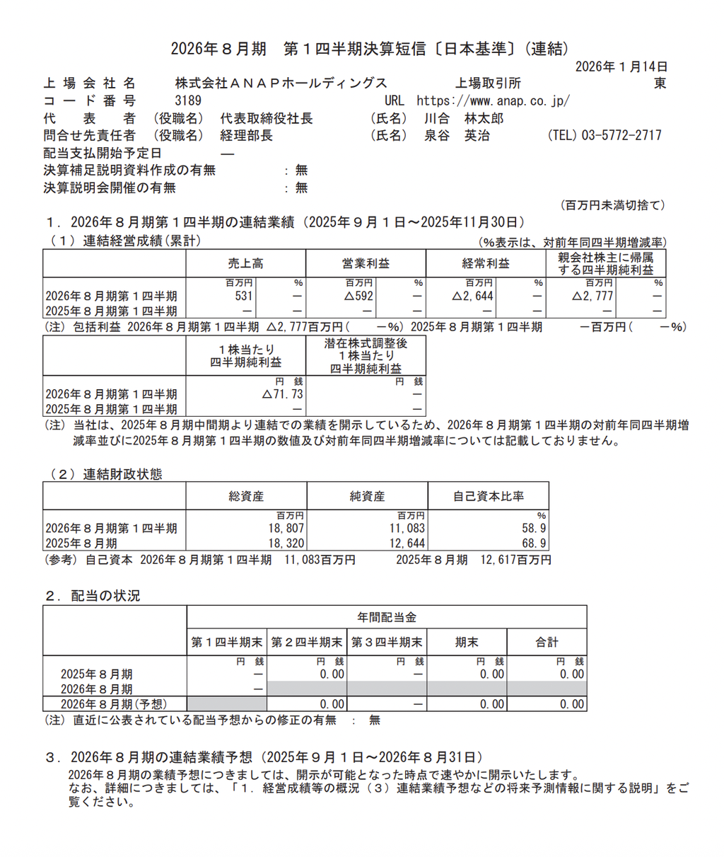ANAPホールディングス 2026年8月期第1四半期決算