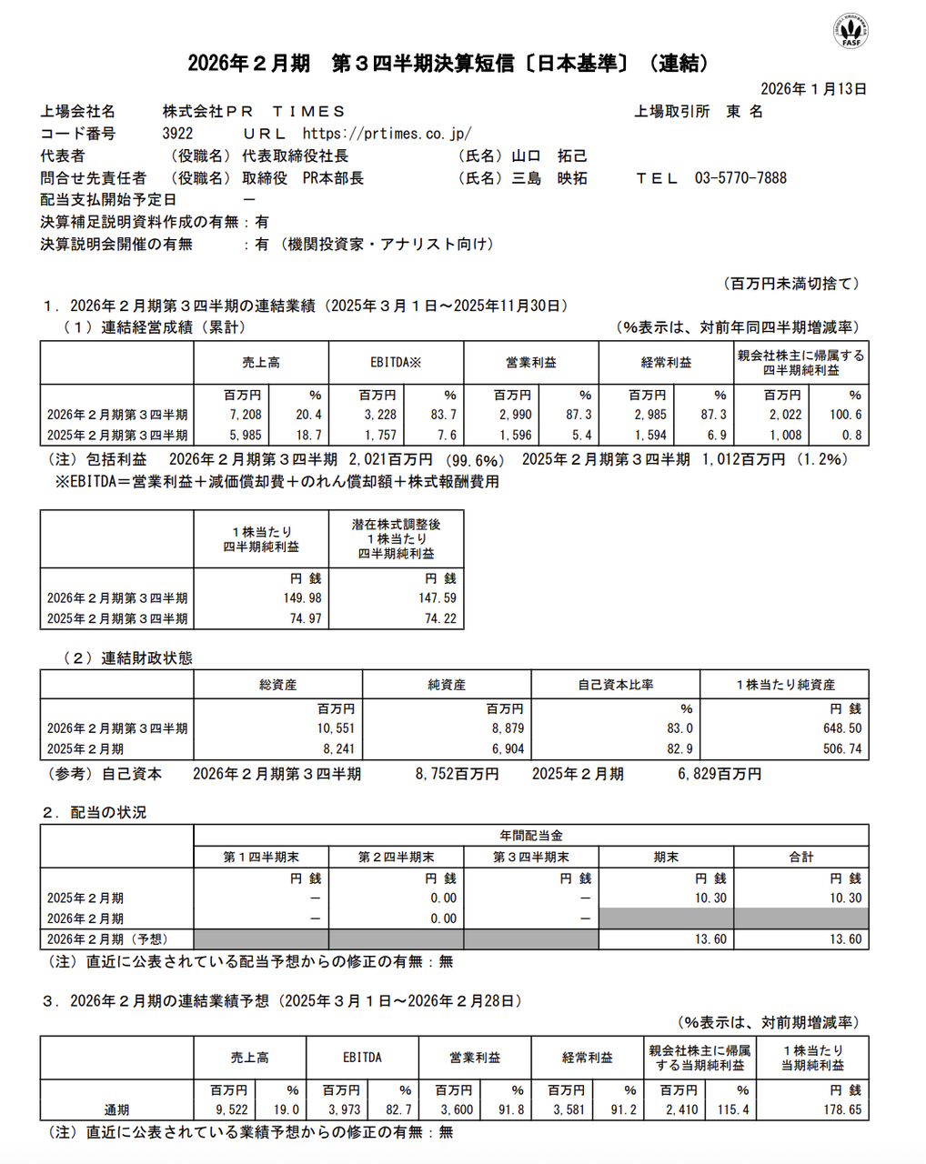 売上高:72億800万円(前年同期比+20.4%)営業利益:29億9000万円(同+87.3%)経常利益:29億8500万円(同+87.3%)純利益:20億2200万円(同+100.6%)