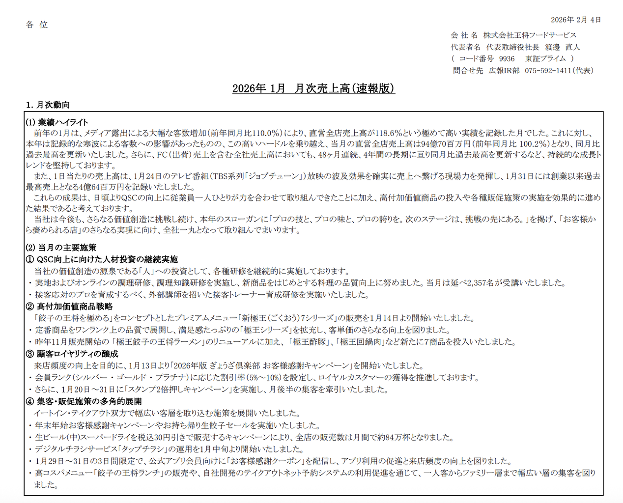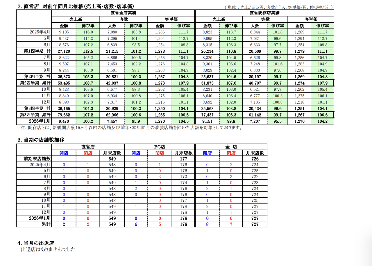 ・月次業績(2026年1月度)(全店)売上高:YonY+0.2%客数:同-4.1%客単価:同+4.5%